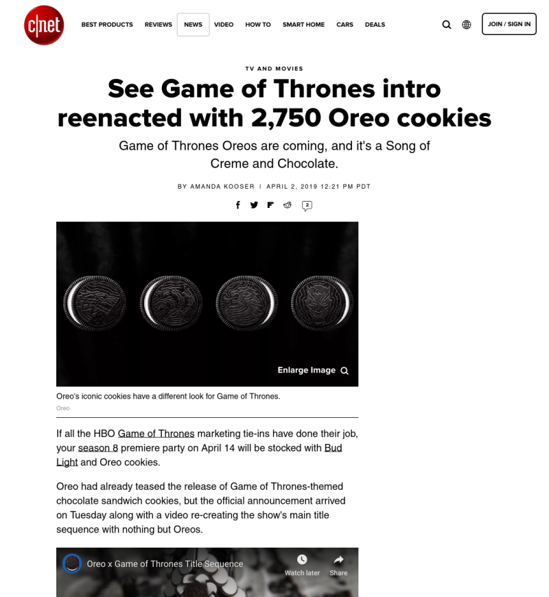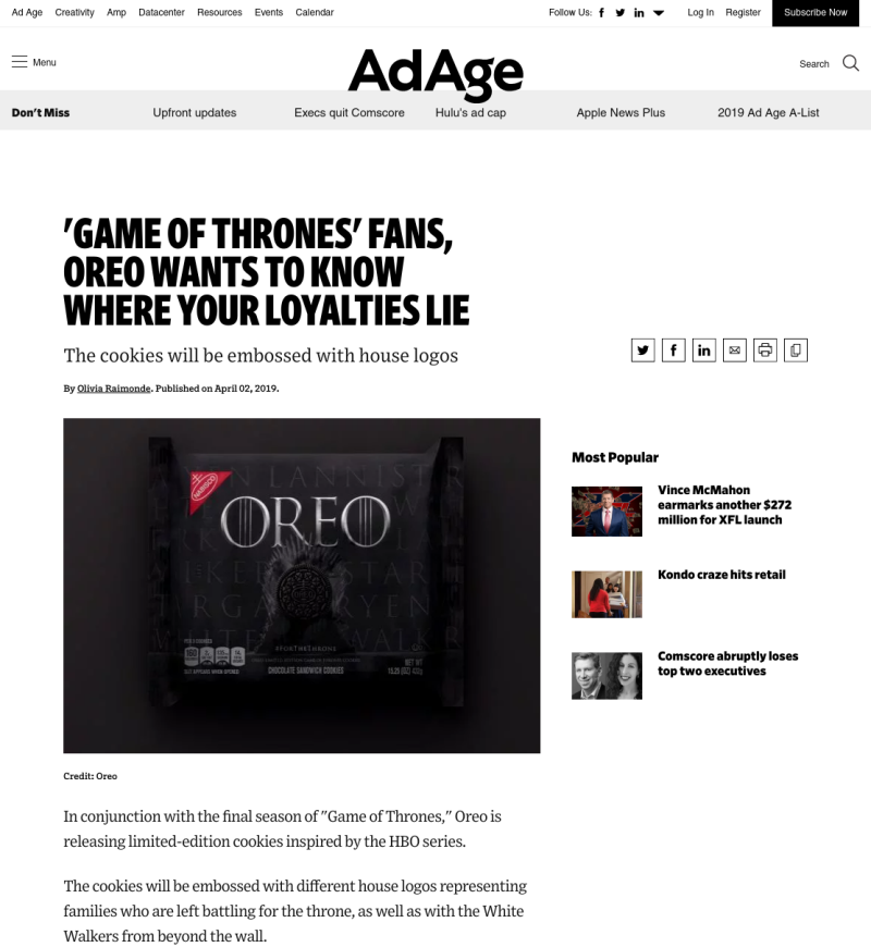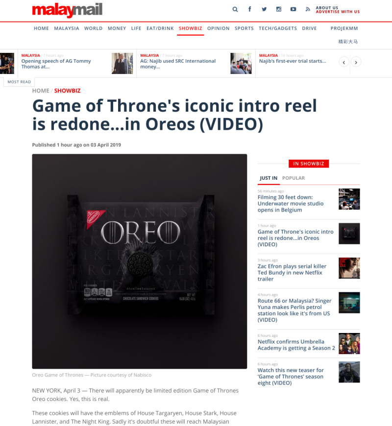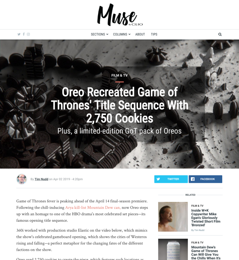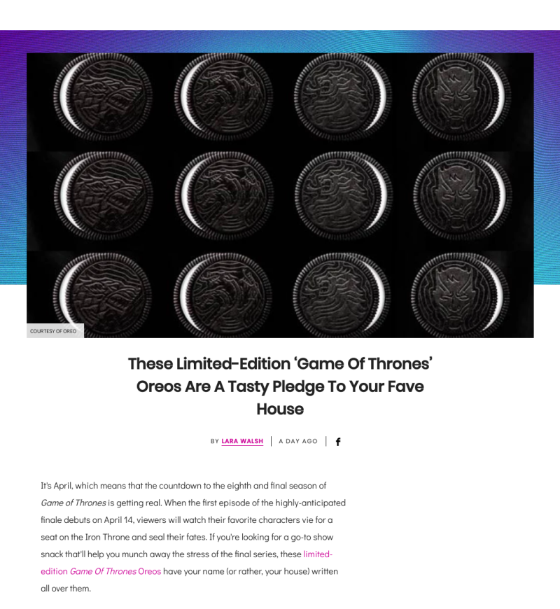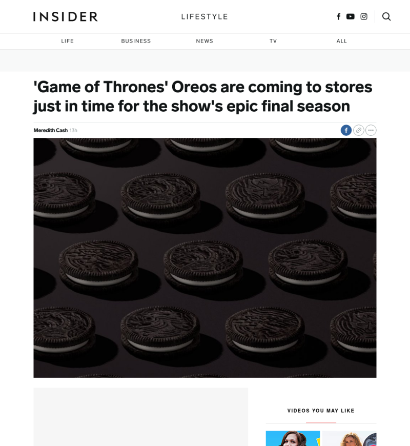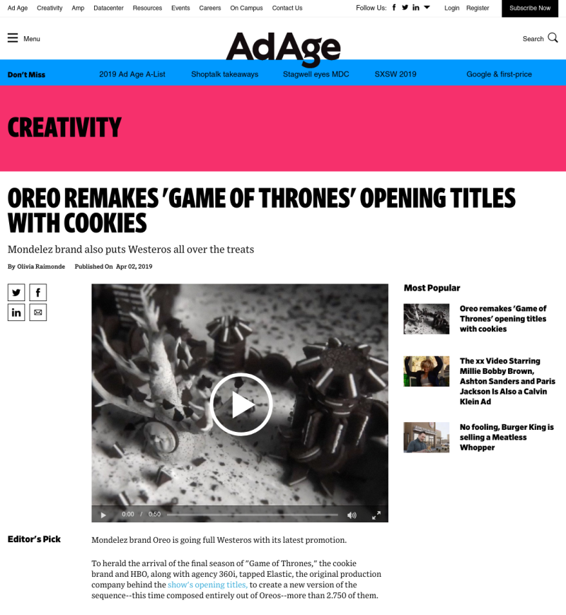 As part of the #ForTheThrone campaign HBO partnered with Oreo to bring to life limited edition Oreo cookies, packaging, and launch film commemorating the final season of HBO's Game of Thrones.